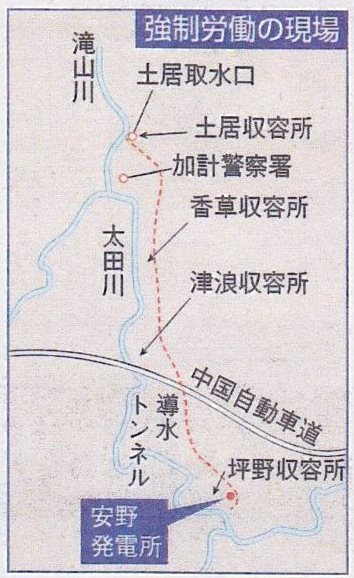 安野発電所は戦時中、戦争遂行に必要な電力をまかなうために、日本発送電(現在・中国電力)が広島県山県郡安芸太田町坪野(当時・山県郡安野村坪野)に建設した。工事を請け負ったのが西松組である。西松組は1944年5月に着工し、日本の敗戦で工事は一時中断したが、戦後中国人が帰国後に工事を再開して46年末に完成した。安野発電所は、土居で滝山川の水を山中の導水トンネルに引き込み、約8km下流の坪野まで運び、坪野で64mの落差を利用して発電する水力発電所である。滝山川は下流で太田川に合流する。