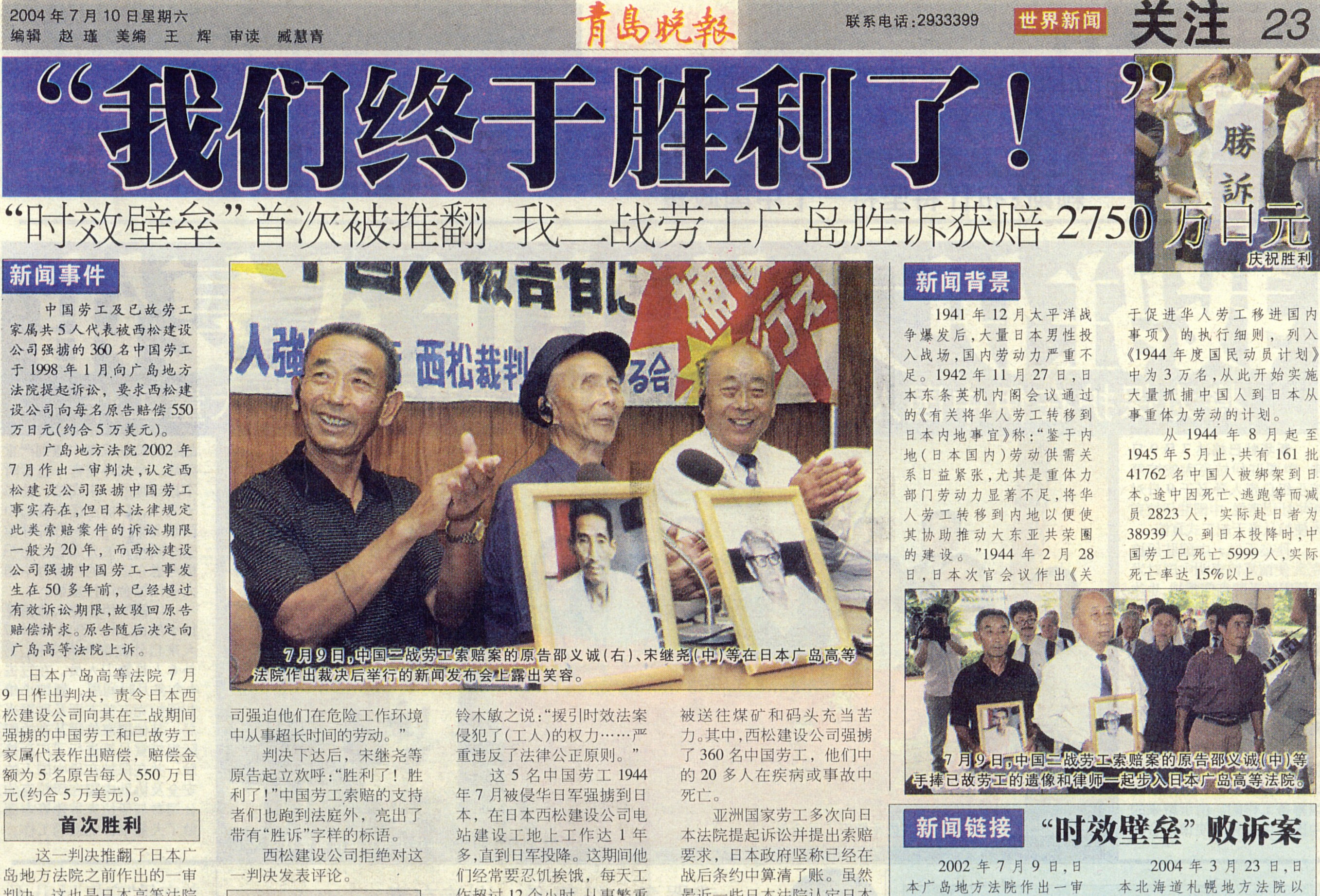 控訴審は、花岡事件を和解に導いた新美隆弁護士が弁護団長に就任した。弁護団は地裁判決を基礎にして、時効の壁を崩すために全力を傾けた。弁護団は勝訴を目指す一方で、和解による解決を裁判所に求めた。2003年7月に広島高裁は和解を勧告し、和解協議が始まった。しかし、西松建設は「中国人強制連行の事実はなかった」と主張して譲らず、2004年2月に和解協議は決裂した。同年7月、広島高裁(鈴木敏之裁判長)は原告逆転勝訴の判決を出した。時効の主張は権利濫用にあたると判断して西松建設に賠償を命じた。日本各地でたたかわれた15件の中国人強制連行事件の中で、高裁レベルで原告が勝訴したのはこの1件だけである。