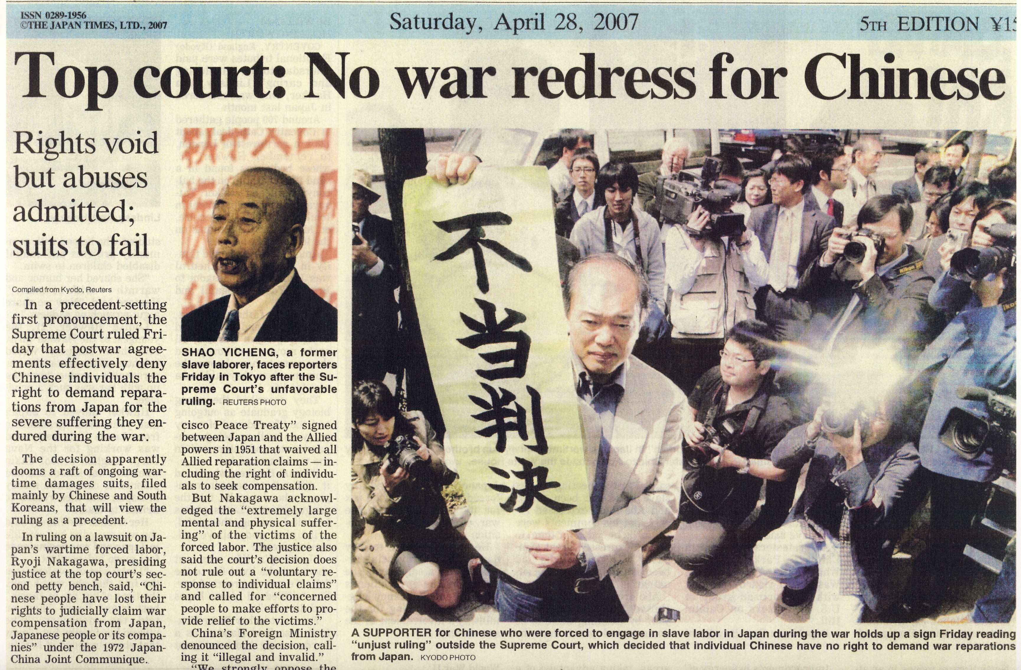 西松建設が上告したため、裁判は最高裁に移った。2007年3月、原告2人(宋継堯、邵義誠)が最高裁で意見陳述を行ない公正な判決を求めたが、同年4月、最高裁は原告逆転敗訴の判決を出した。中国人の賠償請求権は日中共同声明で放棄されたと判断した不当判決だった。しかし最高裁は、判決末尾に「西松建設を含む関係者が被害者の被害の救済に向けた努力をすることを期待する」という異例の付言をつけて、問題解決を促した。ところが西松建設は、「付言は裁判官の意見にすぎず、対応しかねる」と主張して交渉にも応じなかった。