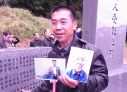 父(健在)の写真を掲げて碑に刻まれた父の名前を指さす息子